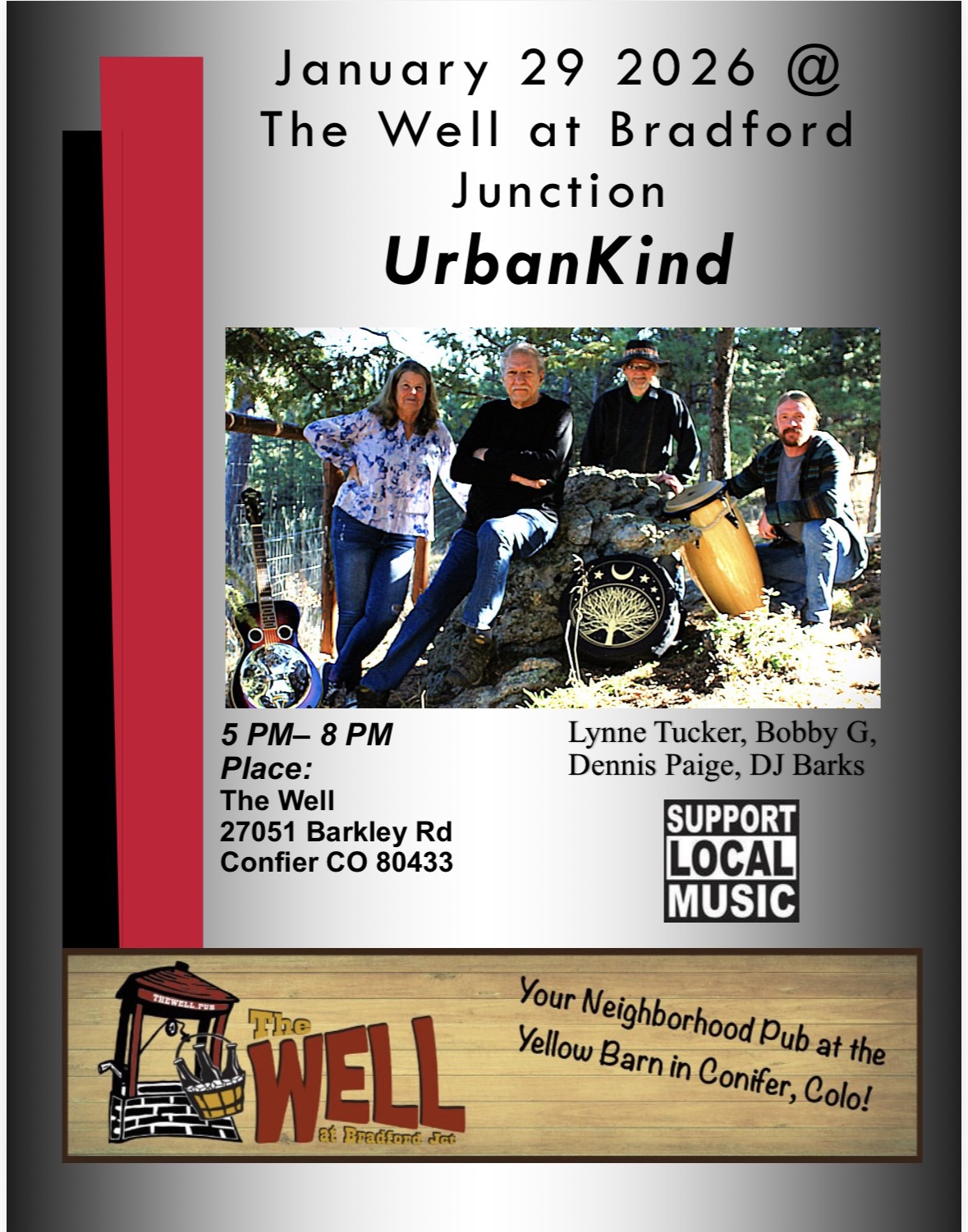 The Well at Bradford Junction 27051 Barkley Rd., Conifer, CO, United StatesA contemporary folk and rock band that includes a lead singer, two guitarists and percussion instruments plus harmonica. $10 minimum per person on food and beverages, no cover.